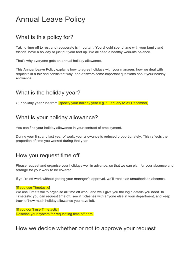Timetastic Annual Leave Policy Template PDF Employment Annual Leave