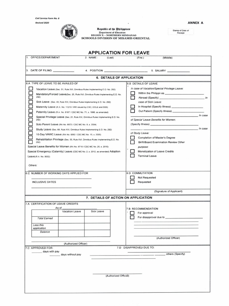 CS Form No. 6, Revised 2020 (Application for Leave) (Secured) ANNEX A