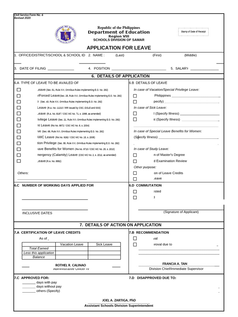 CS Form No. 6 Application For Leave PDF Sick Leave Parental Leave