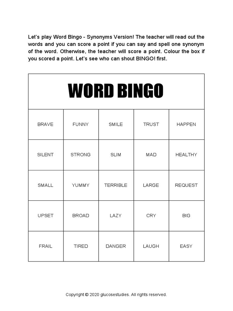 Word Bingo Synonyms PDF PDF