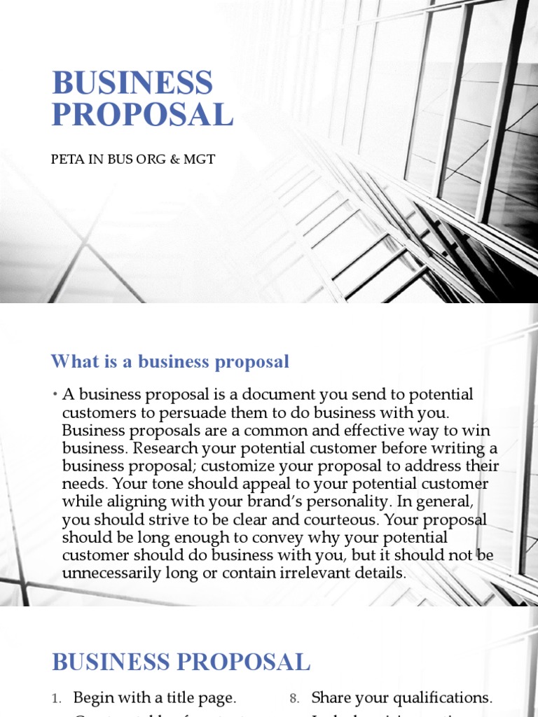 3 steps to a perfect business proposal: This summary helps the reader. 100k+ visitors in the past month Research your potential customer before writing a business proposal;