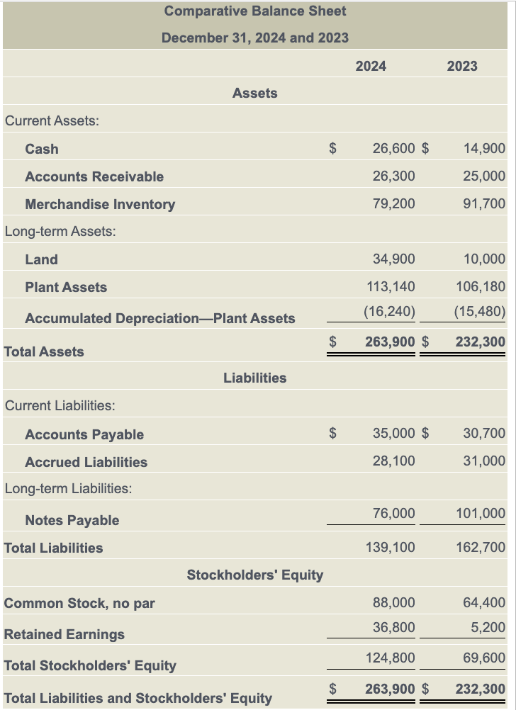 Solved Comparative balance sheets for 2024 and 2023 , a