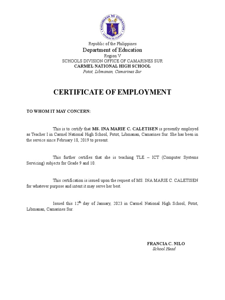 Certificate Of Employment Deped Template Word - Department of education(region)(division)certificate of employment(for public schools/deped.