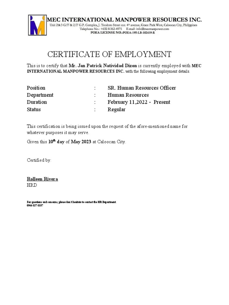 Certificate of employment is used to verify employment history of a former or current employee, while service record is a collection. Original birth certificate issued by the national statistics office (nso) or if there is no certificate of live birth,. Certificate of employment is issued upon request of the employee which will be used to verify employment history of a.