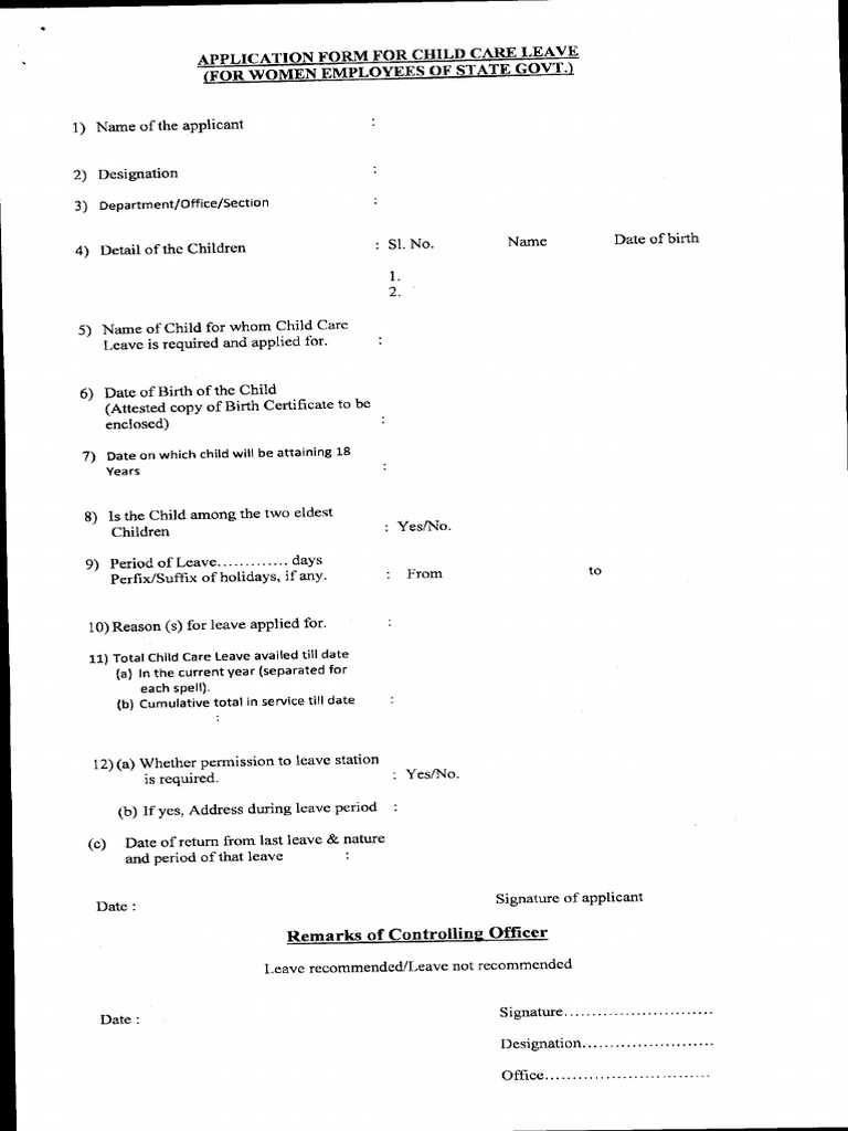 Hence, my leave application details are furnished below. I submit that my presence is required to look after my child namely,.…………………………. Signature of applicant employee id no. Conditions for granting child care leave (ccl) women government employees having minor children (up to 18 years of age) may be. Signature of applicant employee id no.