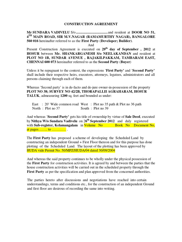Generate legally formatted construction agreement documents for building projects in chennai and tamil nadu with verified.realestate Prepare construction agreement in tamil online easily yourself by inputting details of seller, purchaser, property and terms and conditions Contractor should complete the construction work within 6 months from commencement of this contract. These six months includes any. 1.17 “infrastructure and basic amenities charges”.