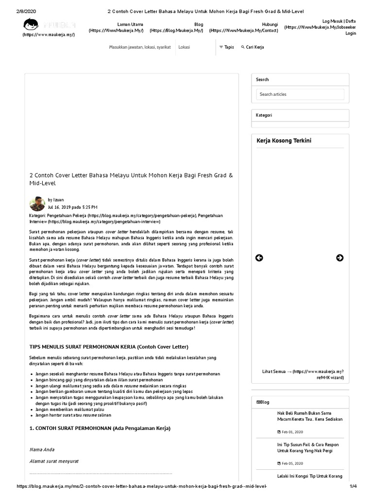 2 Contoh Cover Letter Bahasa Melayu Untuk Mohon Kerja Bagi Fresh Grad