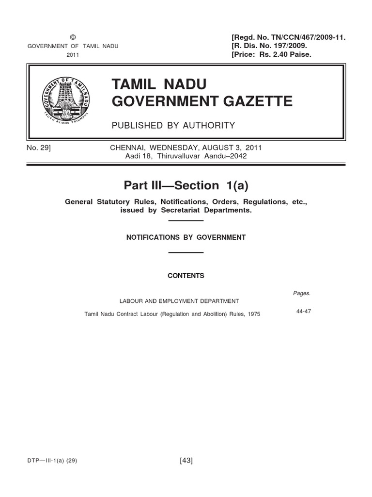 Contract Labour Rules Tamil Nadu - Every application for the grant of a licence shall be accompanied by a certificate by the principal employer 13[in form iii annexed to the tamil. (2) the president and the members of the district forum shall be entitled for such travelling allowance and daily allowance on official tour. These rules may be called the tamil nadu contract labour (regulation and abolition) rules, 1975. The government of tamil nadu vide notification no. During inspection of contractor, sri/m/s_ at it is observed that contractor failed to make payment of wages/paid less wages as per annexure. The government of tamil nadu has revised penalty provisions to enhance compliance, strengthen enforcement, and ensure fair.