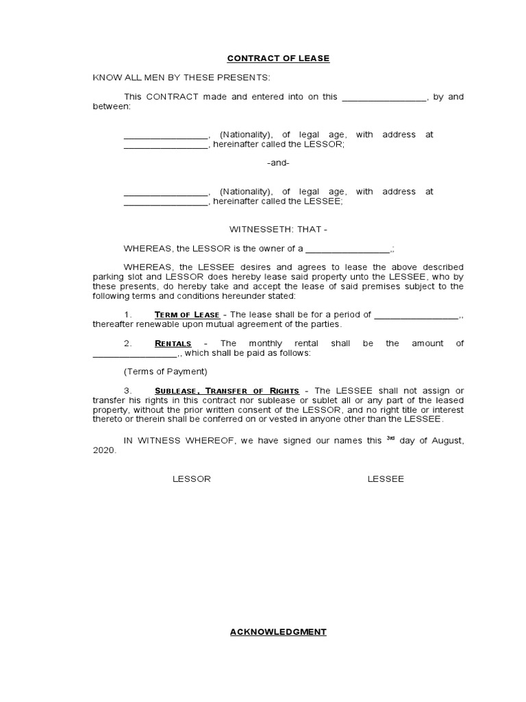 Contract of lease for residential property for a fee, between a landlord and tenant without the right to sublease, undeer the terms. In this post, i’ll show you a contract of lease sample and a template that you can use for your rental properties. This contract of lease is made and executed at the city of _____, this day of..
