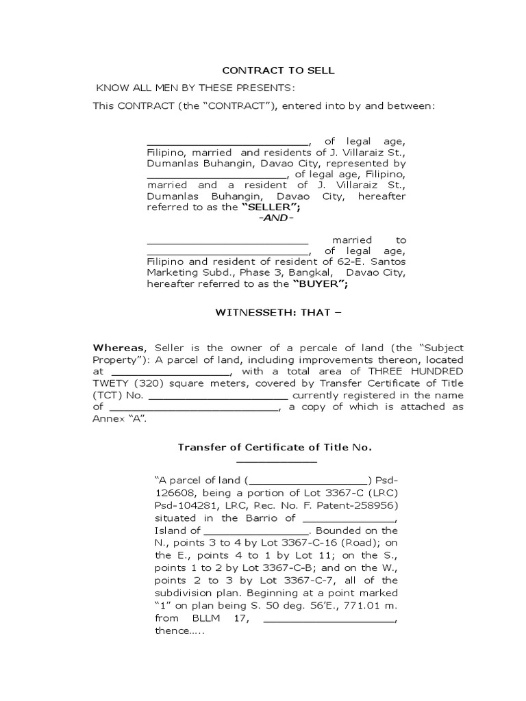(name of seller /vendor), of legal. Contract to sell land, where prior to the execution of the deed of absolute sale, the seller shall retain ownership over the property Contract to sell know all men by these presents: The buyer undertakes to honor and abide by the terms and conditions of the assignment to the third party, and further undertakes.