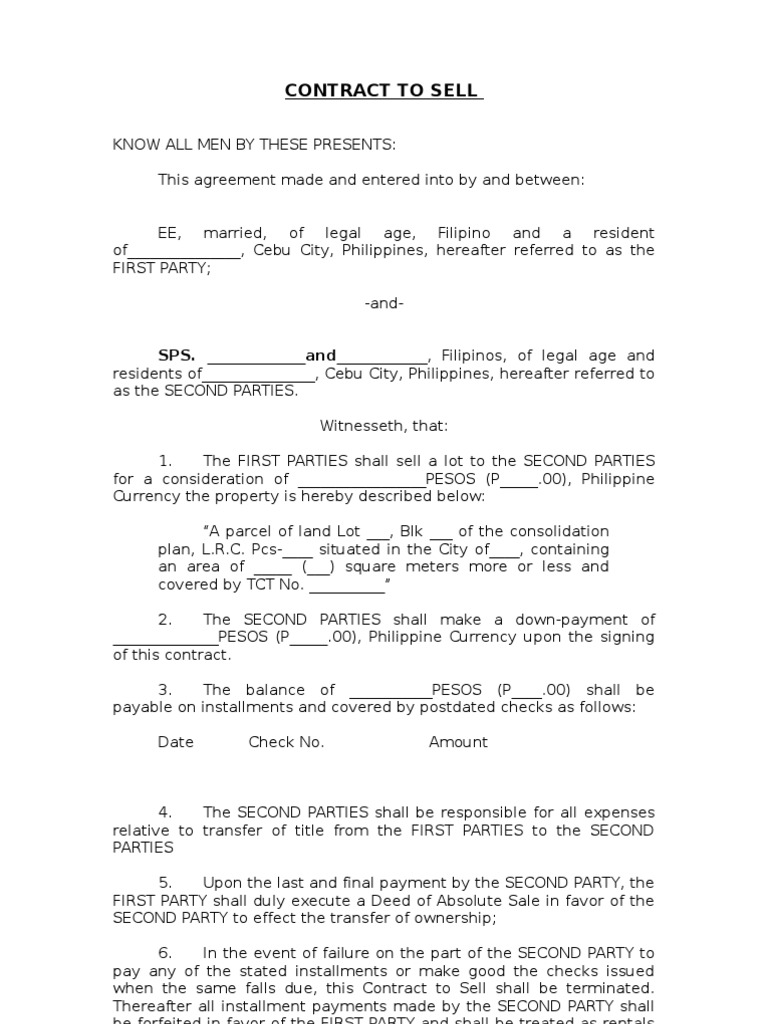 Contract to sell know all men by these presents: This contract, made and entered into at ______________,philippines, by and between __________________, of legal age, single/married. This contract to sell is made and executed and entered into by:. (name of seller /vendor), of legal. This contract to sell, made and executed this ____ day of _________, 20__ by and between: