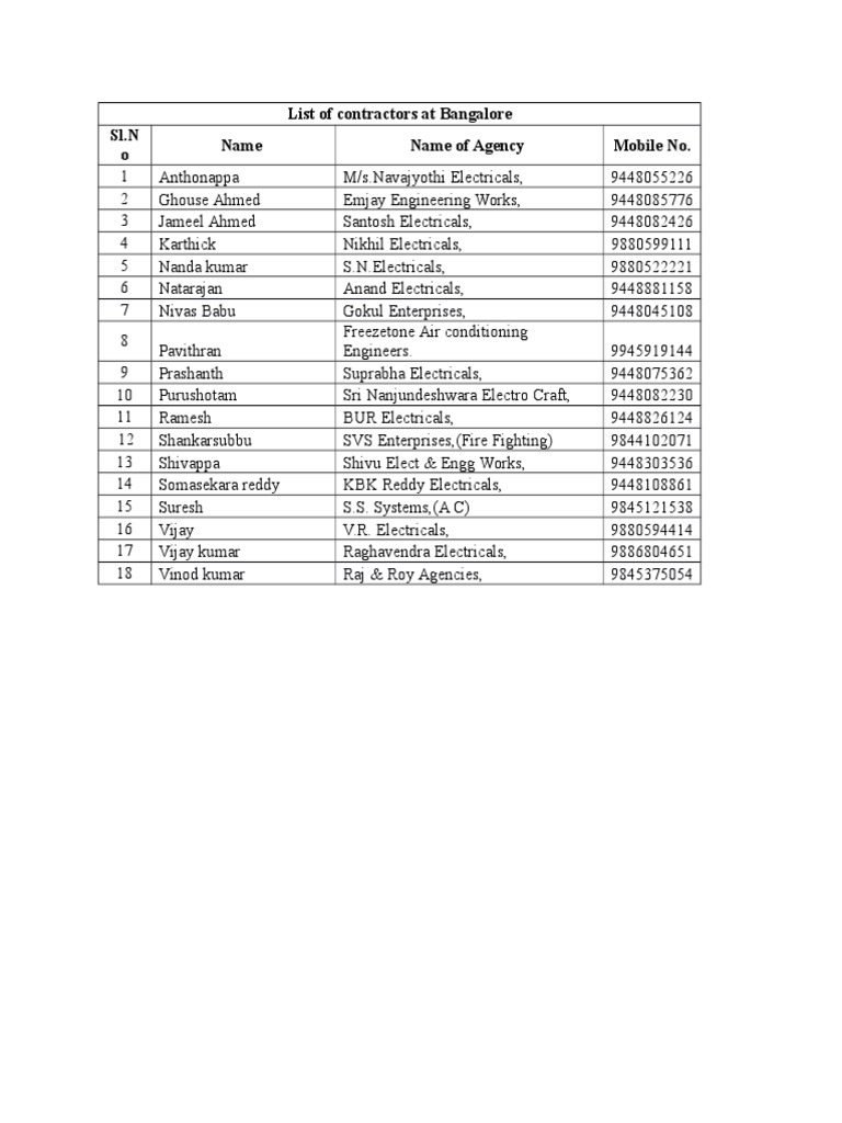 List of Ele Contractors at Bangalore PDF