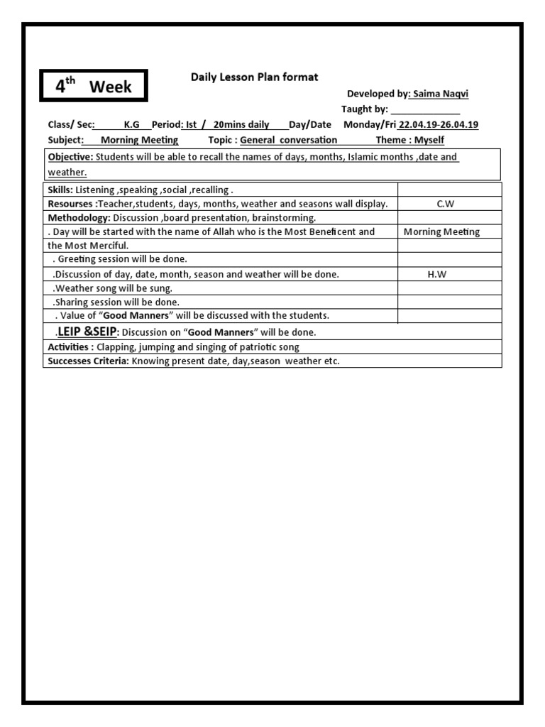 Daily Lesson Plan Format 4 PDF Lesson Plan Evaluation