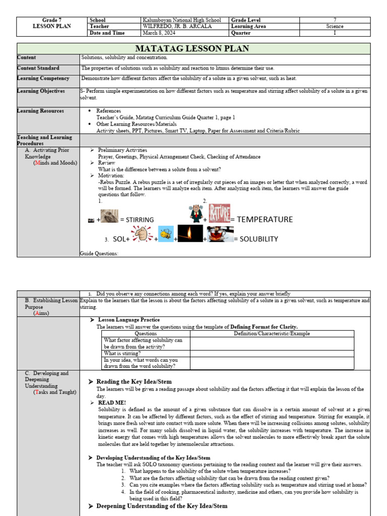 MATATAG LESSON PLAN For Demo PDF Solubility Learning