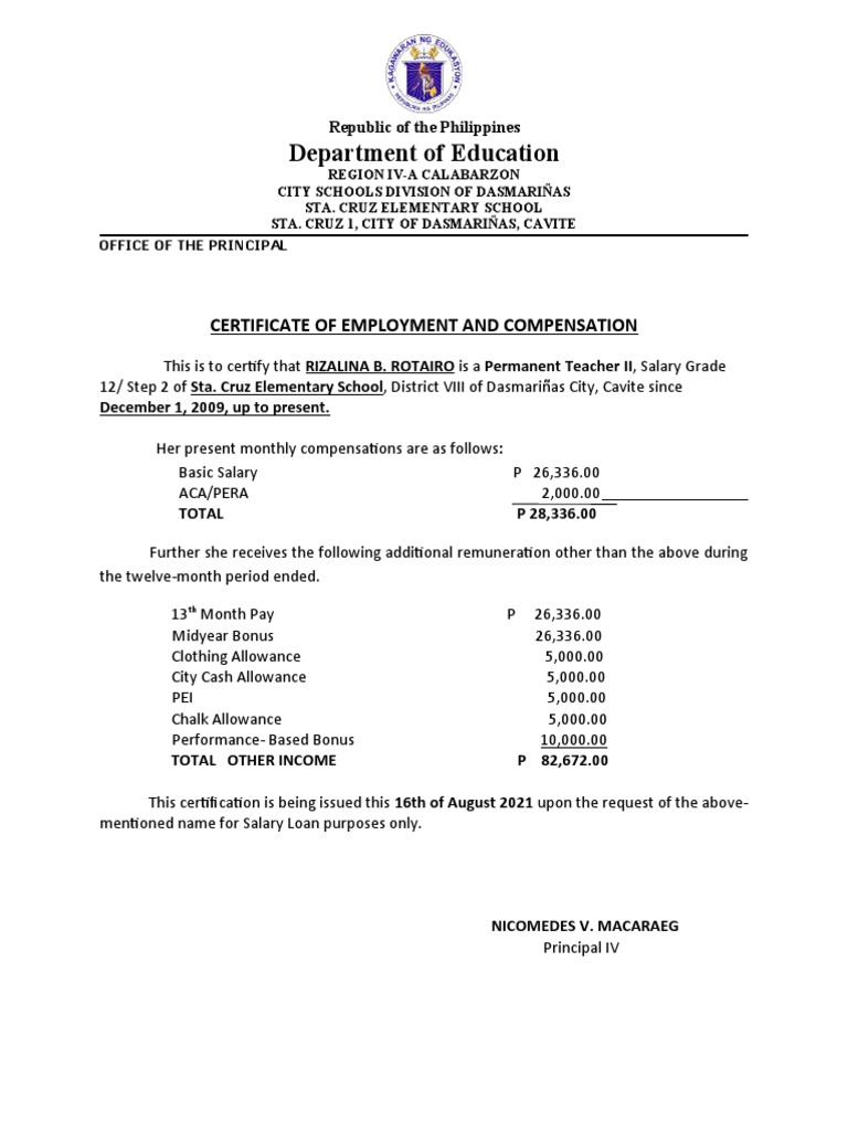 Certificate Of Employment With Compensation Deped Free Printable Template