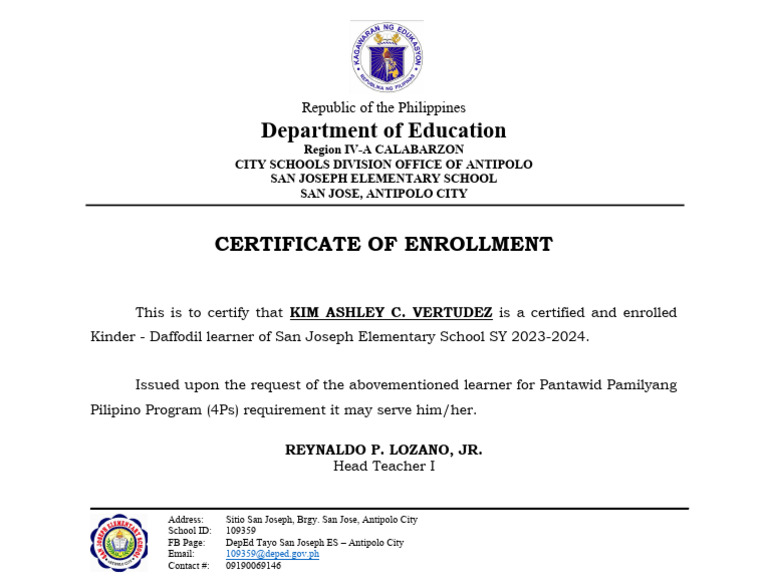 Certificate Of Enrollment DepEd