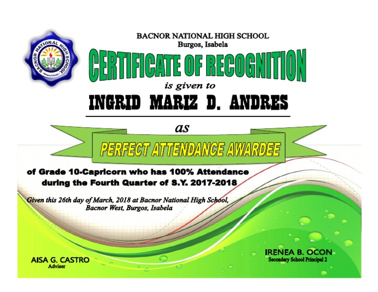 This document contains two perfect attendance awards from burgos national high school in isabela, philippines. Recognition for perfect attendance attend and actively participate in class. The first award is given to. Perfect attendance means that a learner must be present in all of. The department of education (deped) has released deped order no.