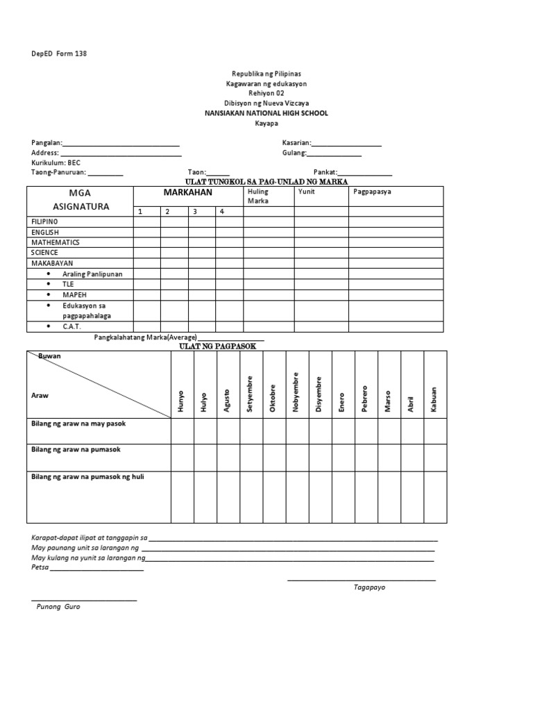 Deped Matatag Form 138 - The school form 9 (sf9) or the learner’s progress report card is formerly known as form 138. It is a school document with the learner’s academic,.