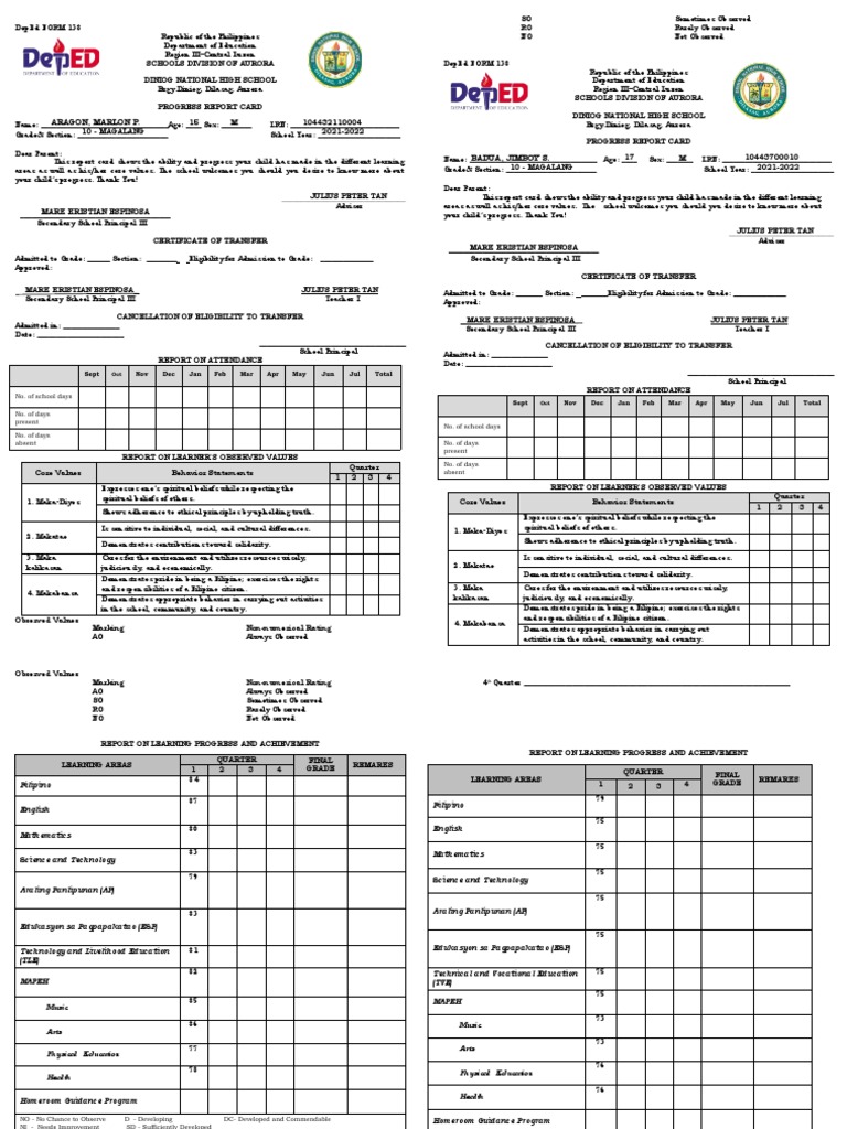 The school form 9 (sf9) or the learner’s progress report card is formerly known as form 138. It is a school document with the learner’s academic,.