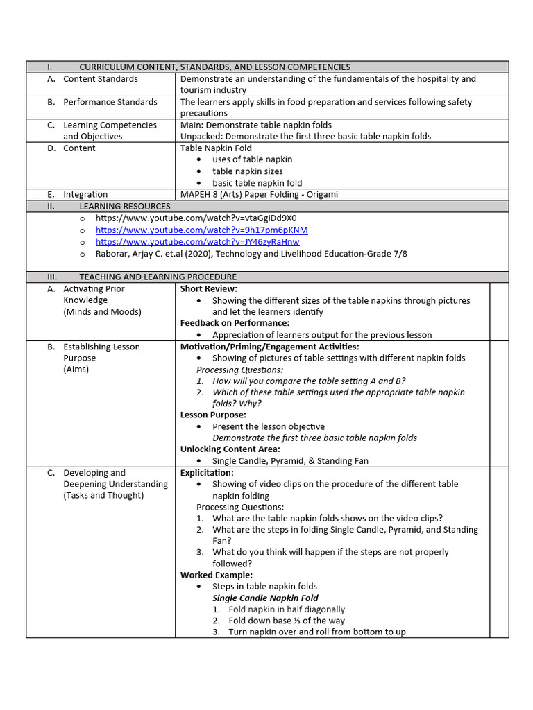 G7 Tle Matatag Lesson Plan FCS PDF Learning Origami