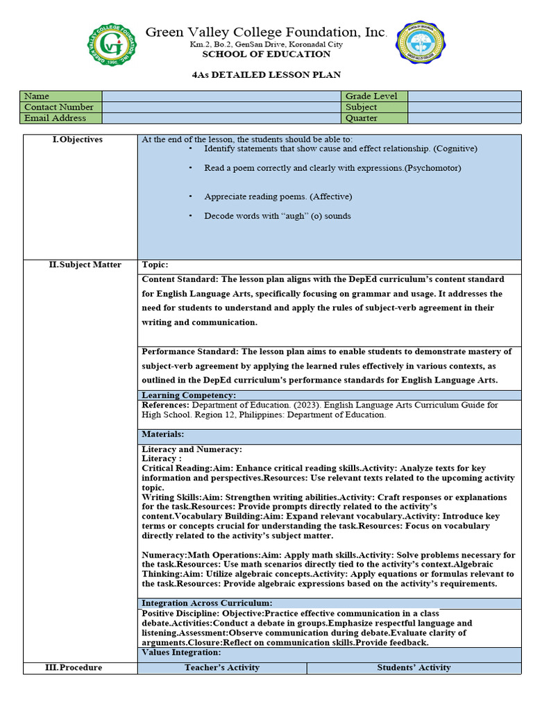 Example Of 4as Detailed Lesson Plan Printable Templates Free