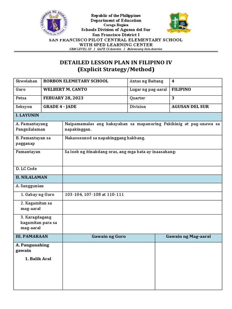 Detailed Lesson Plan Format In Filipino - According to stronge (2007), research shows that instructional planning for effective teaching has the following elements:. Learn how to create a dlp for teachers, a tool that outlines the objectives, activities, and assessments for daily class.