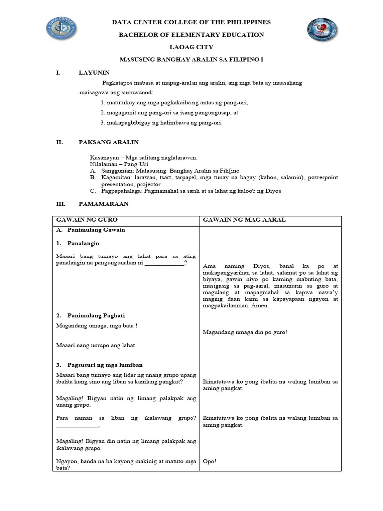 DETAILED LESSON PLAN IN FILIPINO Grade 1 PANG URI PDF