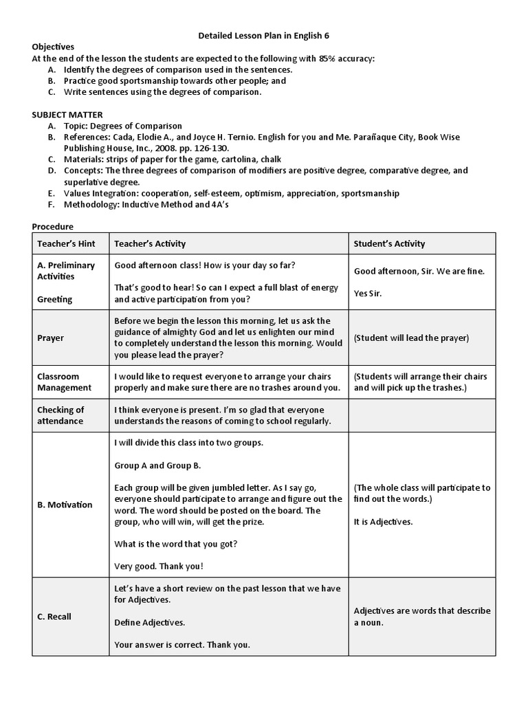 Detailed Lesson Plan Template ENGLISH PDF Adjective Lesson Plan