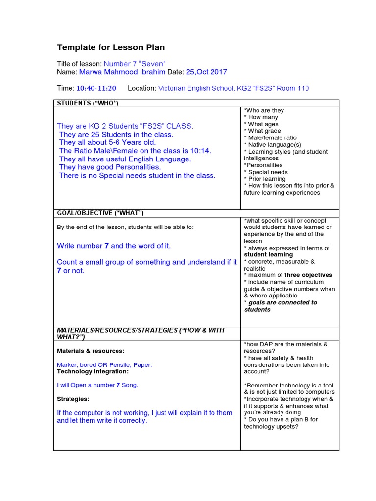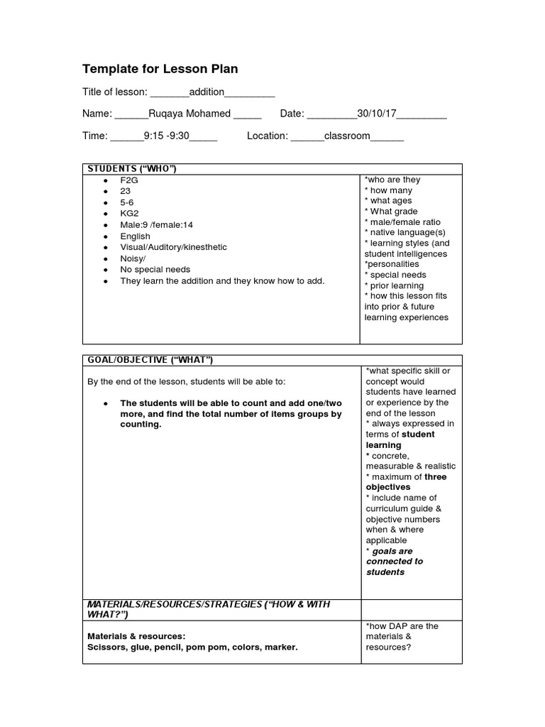 Template For Lesson Plan Title of Lesson Name Date Time Location