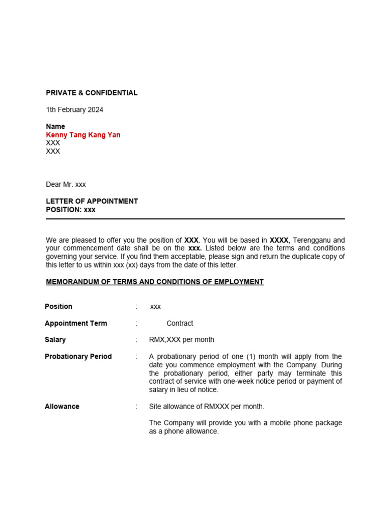 Labour Law Malaysia Appointment Letter Sample Job Appointment Letter