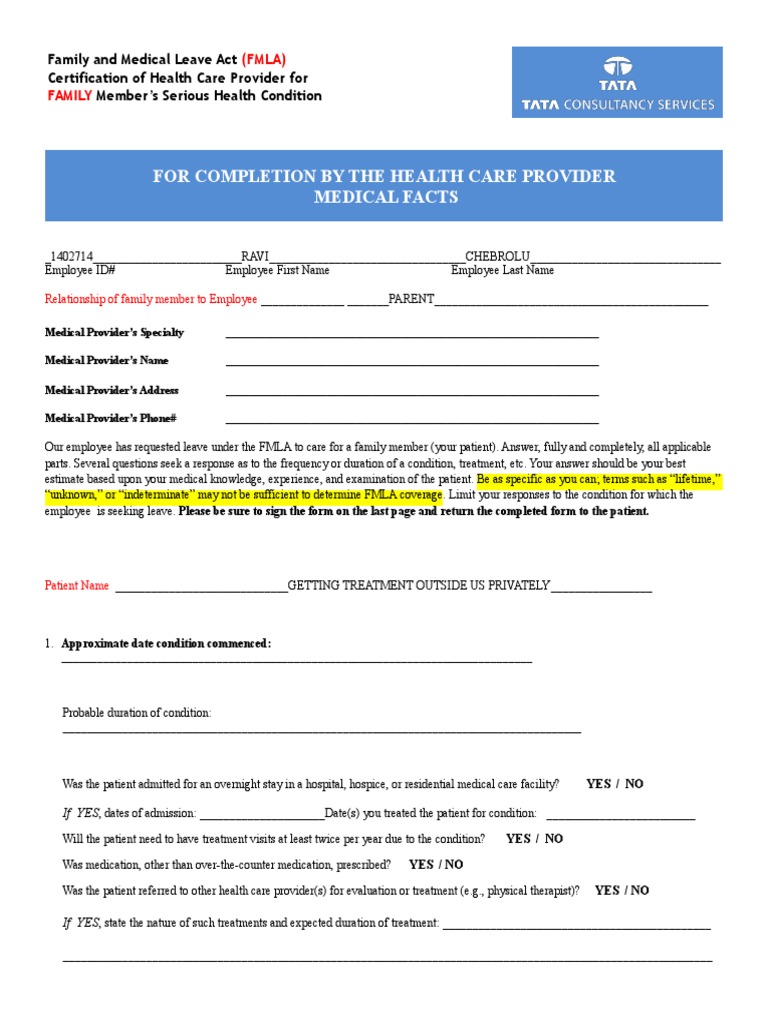 Family and medical leave certification employee: Certification of family member’s serious health condition for family and medical leave this form must be completed by a. Obtain these forms from your human resources office, if needed. Your patient may be applying due to their own serious health condition, their pregnancy, or to care for a family member. Describe the care you.