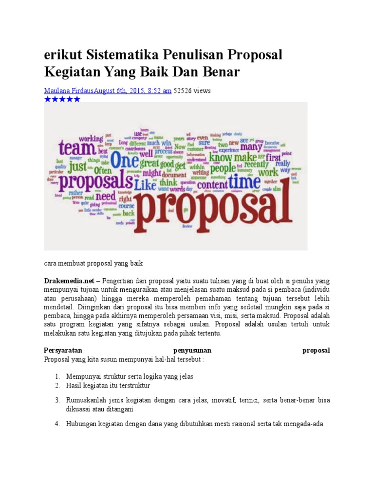 Berikut adalah contoh struktur dan format penulisan proposal yang umum digunakan: Proposal kegiatan adalah sebuah rencana acara yang ditulis dengan tujuan permohonan izin dan dukungan berupa dana.