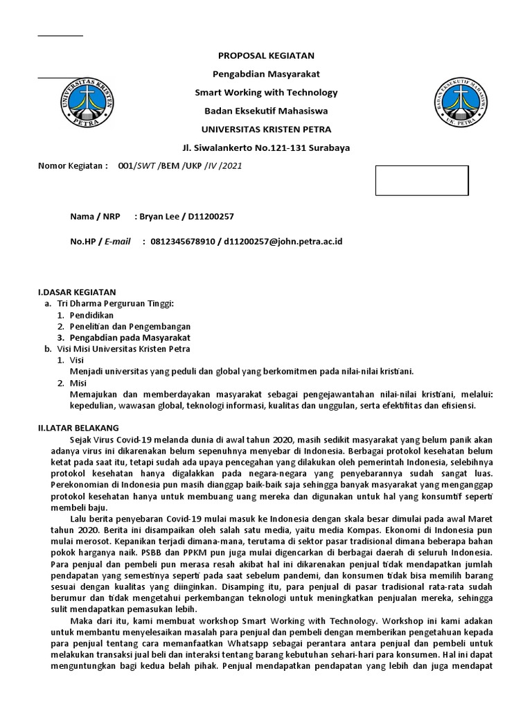 Panduan lengkap ini akan memandu anda dalam memahami, membuat, dan menggunakan. Waktu dan tempat pelaksanaan jelaskan secara rinci kegiatan online atau offline. Hari, waktu keterangan pic tempat tanggal i. Uraikan luaran hasil kegiatan secara detail misal berupa artikel di media cetak/online, artikel pengabdian yang dipublikasi di jurnal, video. Kamus besar bahasa indonesia (kbbi), proposal kegiatan adalah serangkaian rencana yang dituangkan.