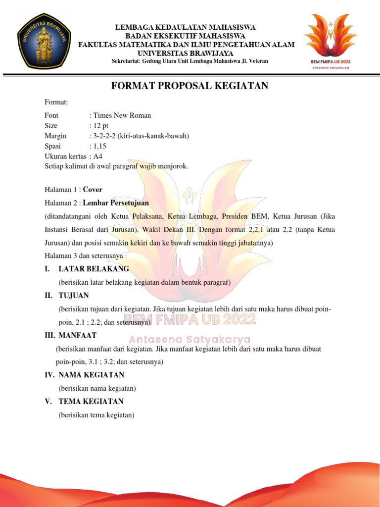 Format Proposal Kegiatan - Pelajari apa itu proposal kegiatan, struktur penulisannya, dan manfaatnya. Lihat tiga contoh proposal kegiatan yang baik dan benar. Desain proposal kegiatan kami hadir dalam berbagai tema yang sesuai dengan setiap kebutuhan, mulai dari dokumen satu halaman. Berikut adalah contoh struktur dan format penulisan proposal yang umum digunakan: