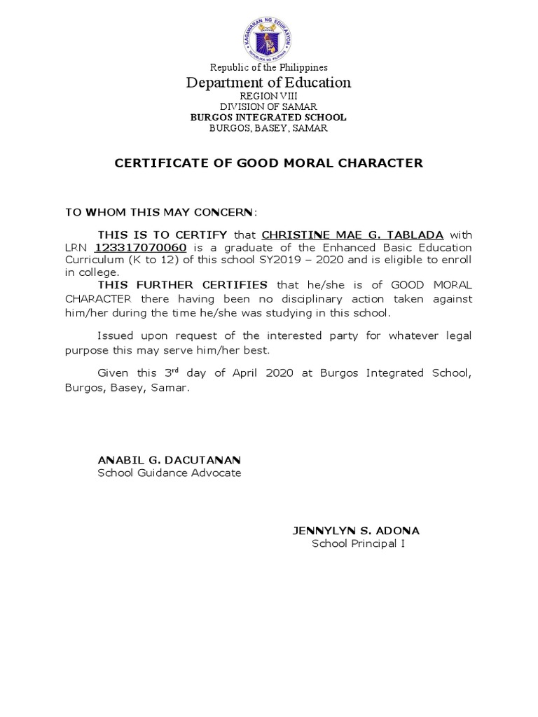 Certificate of good moral character to whom it may concern: This is to certify that ______________________________ is a grade. If you need this for your job application abroad, you need to bring the certification or school records to the regional. Abstract a good moral character certificate (gmcc) is routinely required in the philippines when a learner transfers schools,.