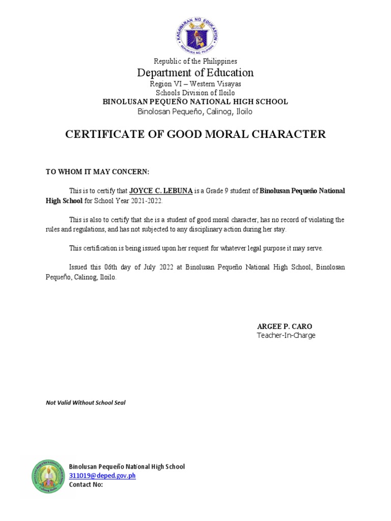 Certificate of good moral character to whom it may concern: Abstract a good moral character certificate (gmcc) is routinely required in the philippines when a learner transfers schools,. This is to certify that ______________________________ is a grade. If you need this for your job application abroad, you need to bring the certification or school records to the regional.