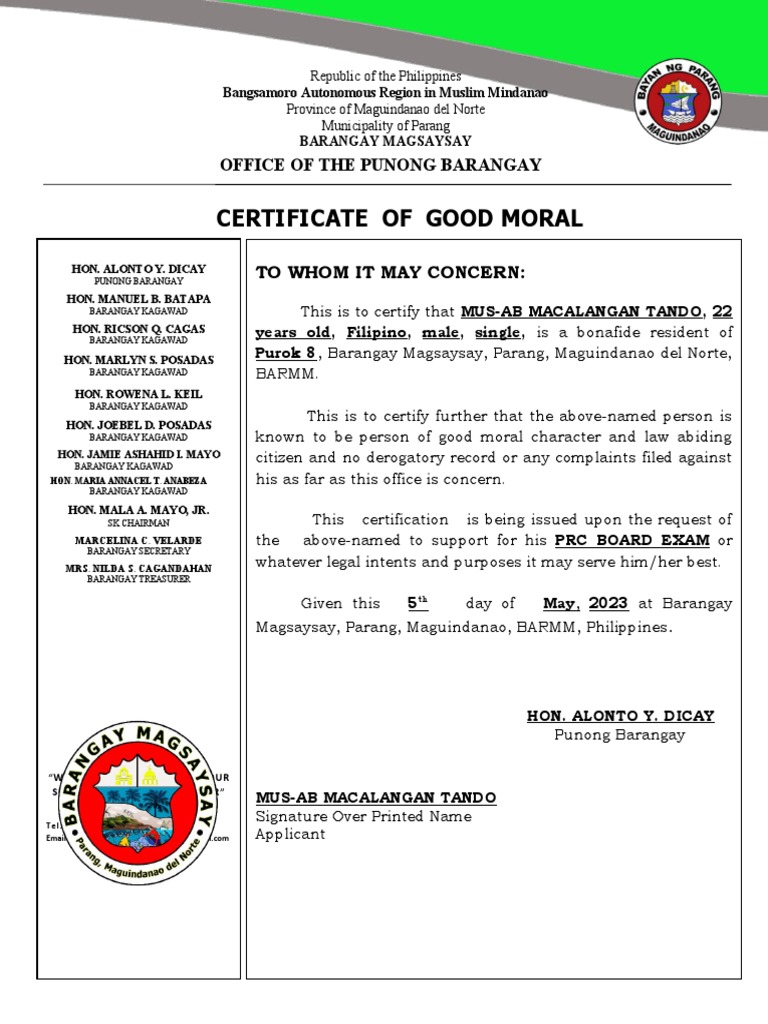Certificate of Good Moral 2023 PDF Philippines