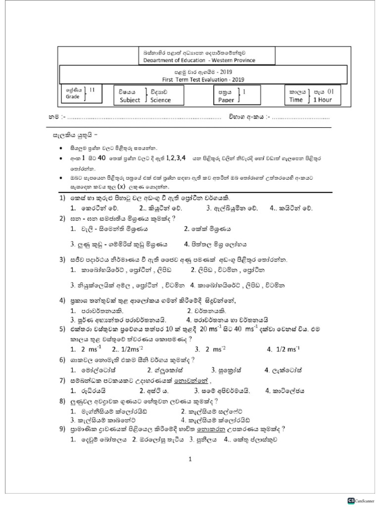 Grade 11 Science 1st Term Test Paper 2019 Sinhala Medium Western