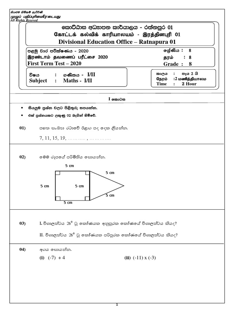 2020Grade08Sinhala mediumMathematicsFirstTermTestPaperWith