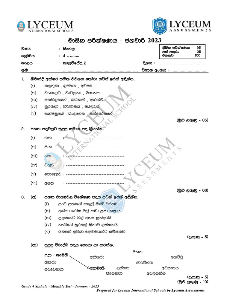 Grade 4 Sinhala Papers Pdf - 01 ශ්රේණියේ සිට 13 ශ්රේණිය දක්වා සියලුම විෂයයන්ගේ විෂය නිර්දේශ, ගුරු මාර්ගෝපදේශ සංග්රහ, පෙළ පොත්, ආදර්ශ. தரம் 04 மாணவர்களுக்கான 2ம் தவணை கணிப்பீட்டு வினாத்தாள்கள் இங்கே. The #1 largest educational portal for students in sri lanka. Download grade 04 sinhala past papers, school term test papers, textbooks, school syllabus, teachers' guide, and other collection of study.
