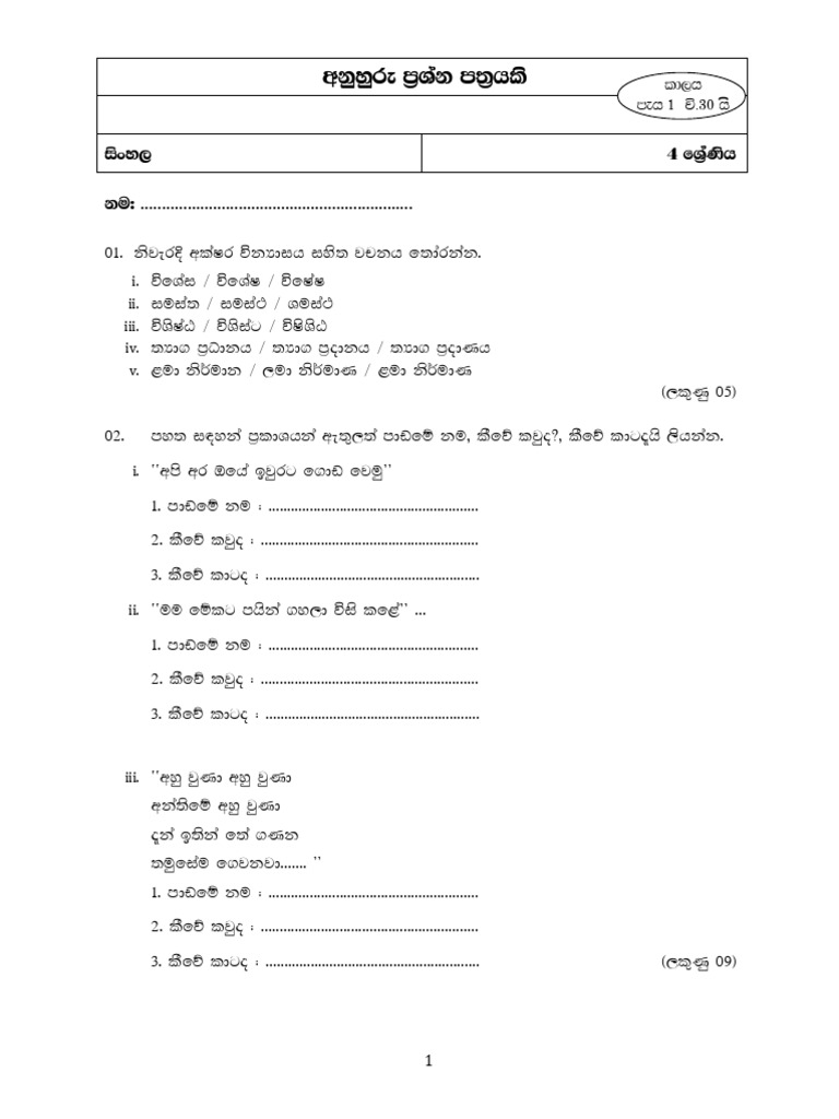 Worksheets are sinhala grade 1, grade 4 sinhala papers, grade 7 science past papers sinhala,. 04 ශ්රේණිය ක්රියාකාරකම් සදහා සිංහල conducted in sinhala medium ගණිතය conducted in sinhala & tamil medium පරිසරය Download grade 04 sinhala past papers, school term test papers, textbooks, school syllabus, teachers' guide, and other collection of study.