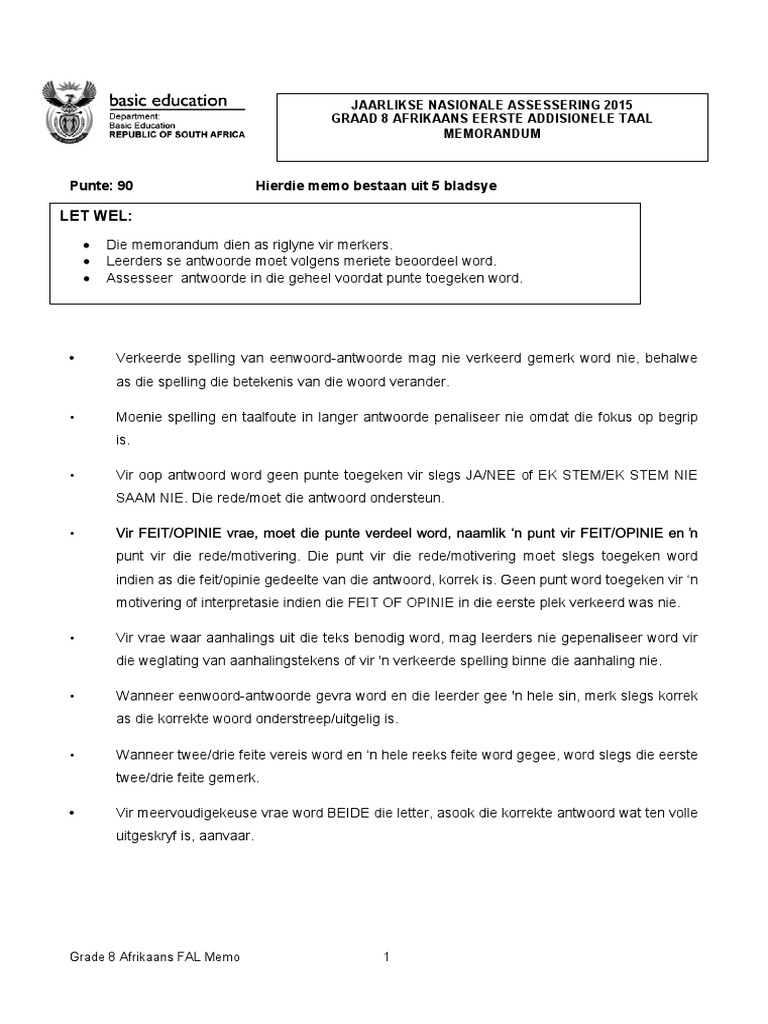 2015 Grade 8 Afrikaans FAL Memo PDF
