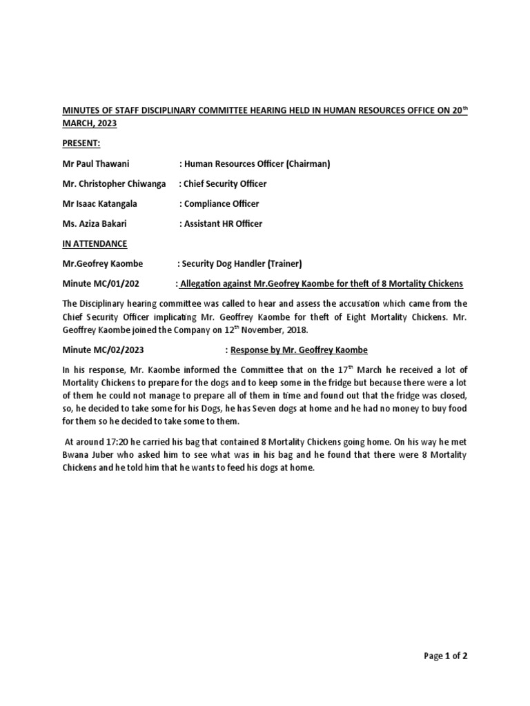 Disciplinary Hearing Minutes For MR Geoffrey Kaombe PDF