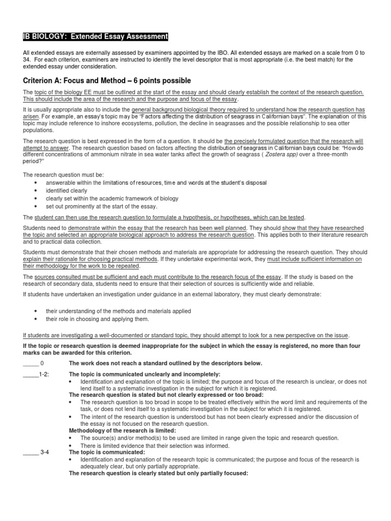 One requirement of the international baccalaureate® diploma programme core, the extended essay is an independent, self. A comprehensive guide to biology extended essay criteria along with a checklist. A biology extended essay should be based on specific, relevant and clearly defined aspects of the biological study of living organisms. Remember that the extended essay is graded using the same rubric regardless of what subject the ee is registered in.