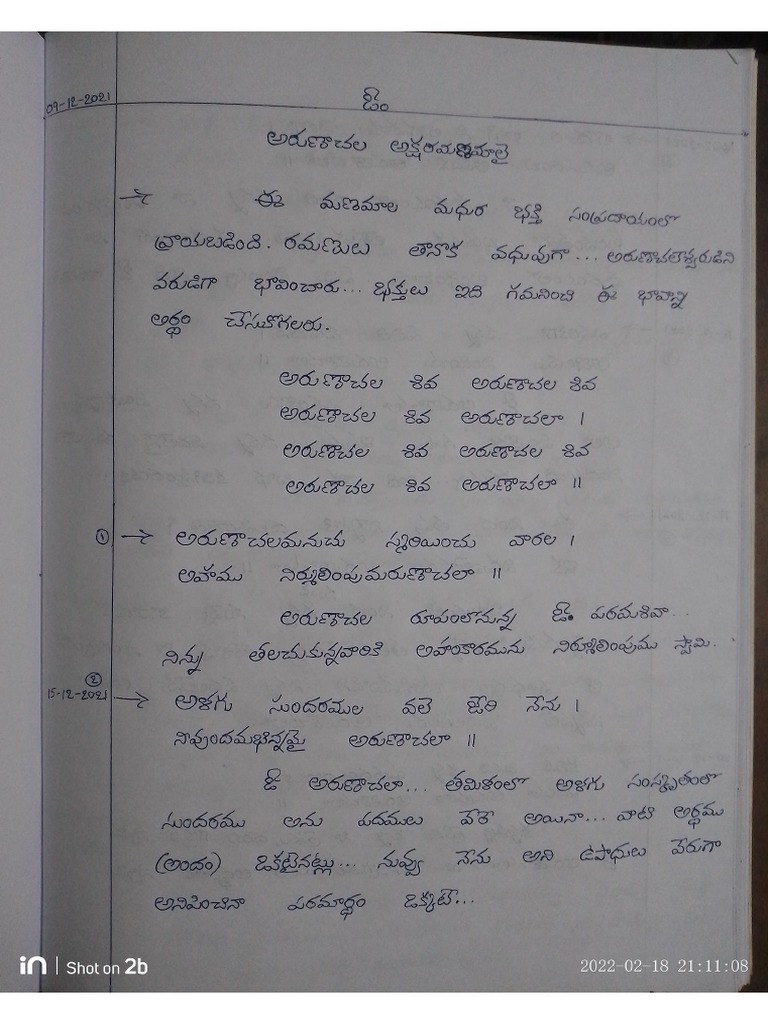 Arunachala Shiva With Telugu Meaning Hand Written Notes PDF