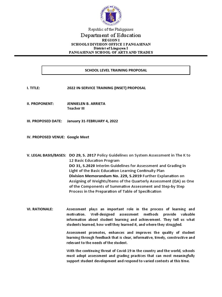 Inset Training Proposal Sample 2022 Pdf - To provide a variety of activities and practices that address the needs of teachers, parents, and students in. It includes the goal and content, the.