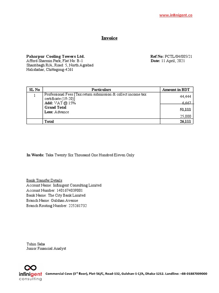 Invoice of Professional Fees PDF