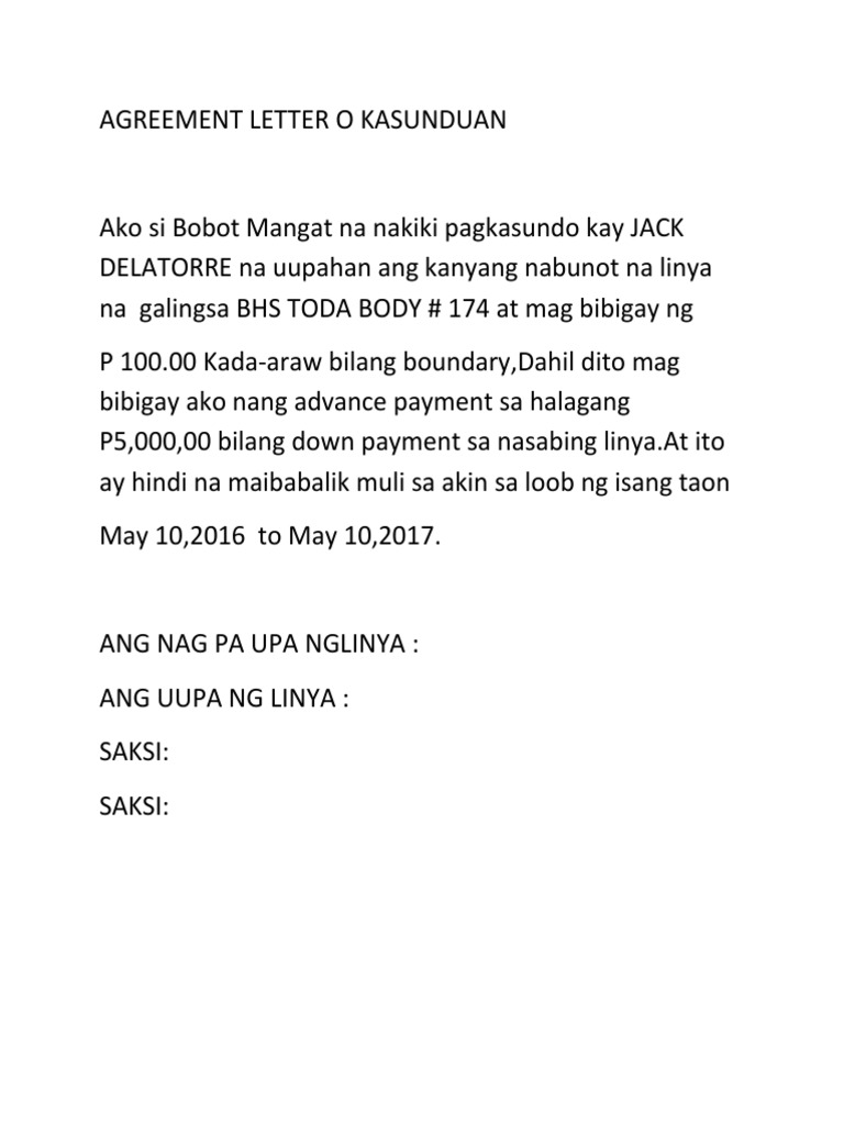 Kasunduan Agreement Letter Sample Tagalog - Halimbawa, ang isang sample agreement letter tagalog para sa utang ay naglalahad ng mga detalye tulad ng halaga,. Napapaloob dito ang lahat ng.