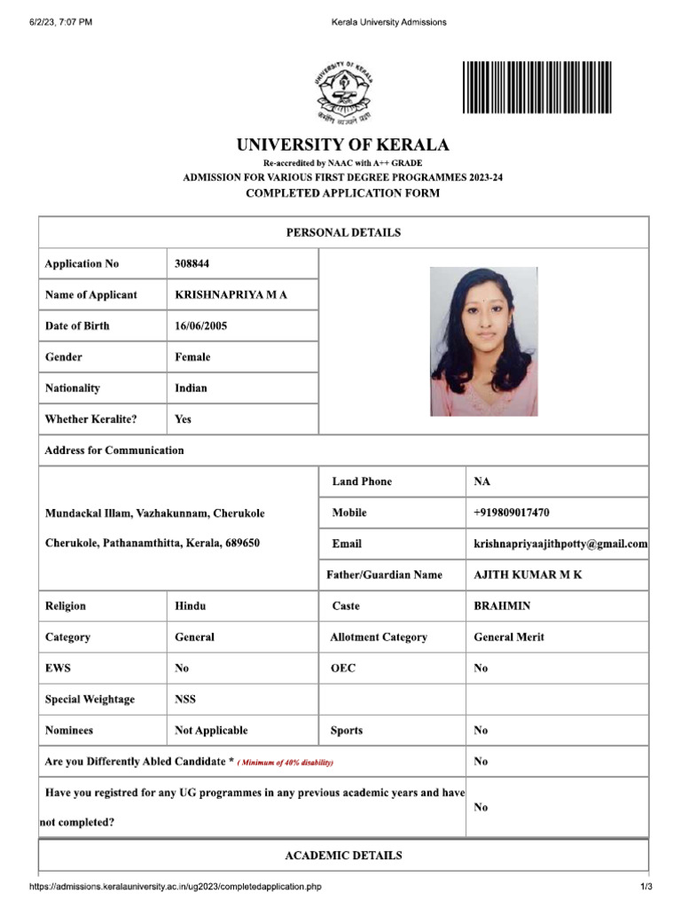 Kerala University Application PDF