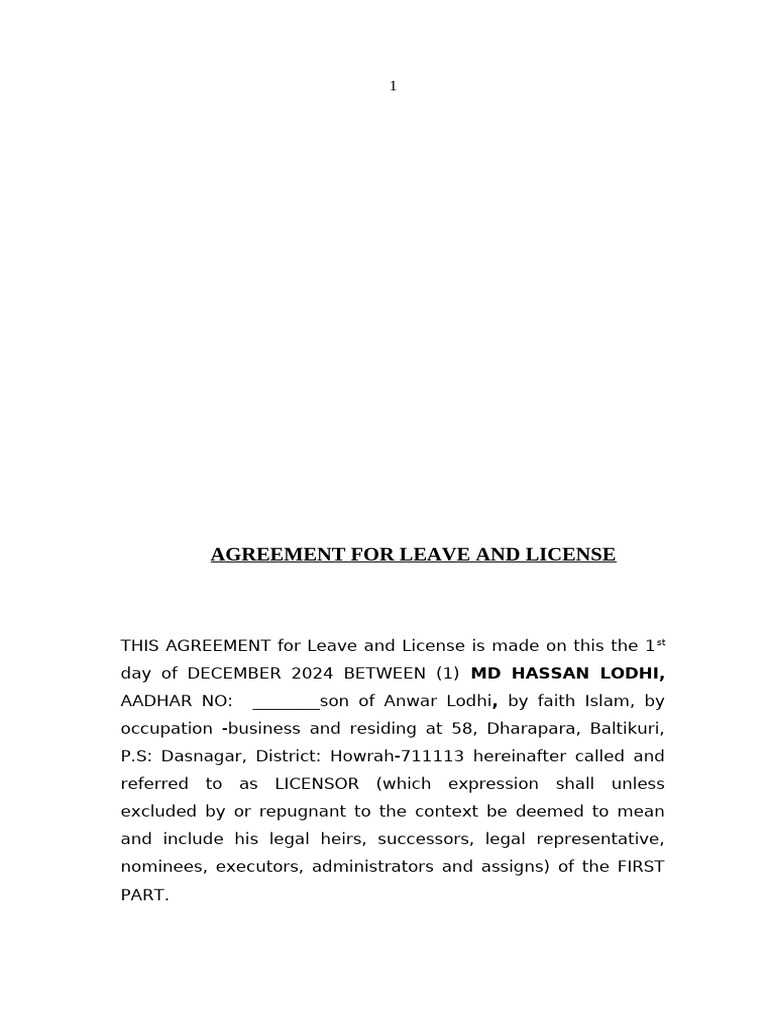 LEAVE AND LICENSE AGREEMENT HASSAN PDF License Business Law
